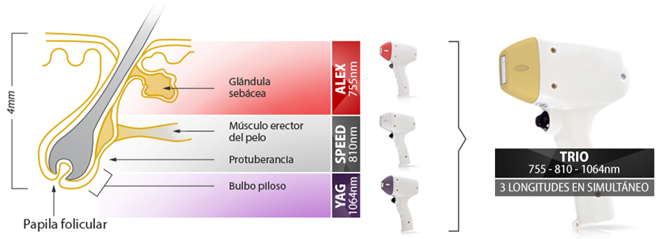La longitud de onda Alejandrita ofrece una absorción de energía más potente por parte del cromóforo de melanina y por eso es ideal para una mayor variedad de tipos y tonos de vello, especialmente el vello fino y claro. La longitud de onda de 755 nm tiene una penetración más superficial y ataca la tumescencia del folículo piloso. Es especialmente eficaz en el vello subcutáneo en zonas como las cejas y el labio superior.